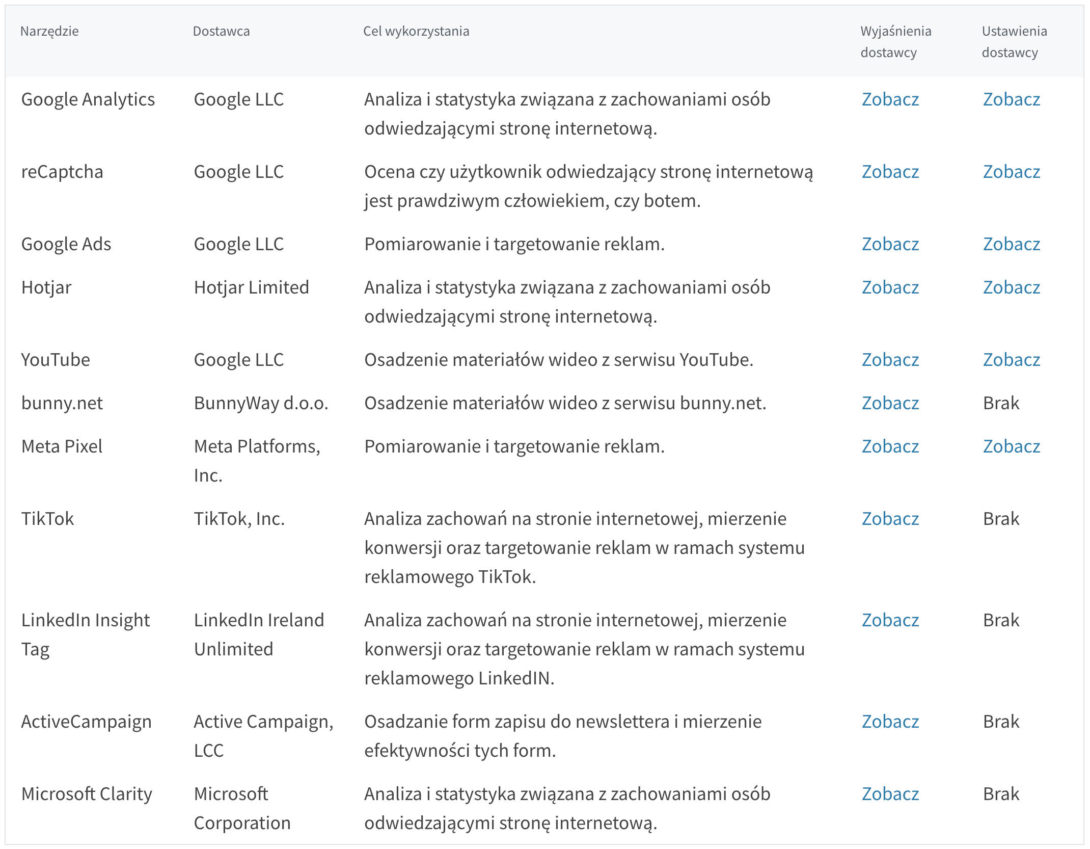 W ramach naszej strony internetowej funkcjonują pliki cookies lub inne podobne technologie podmiotów trzecich związane z narzędziami wymienionymi w załączniku nr 2 do niniejszej polityki prywatności. Poszczególne narzędzia mogą wykorzystywać więcej niż jeden plik cookies, ale odstąpiliśmy od ich szczegółowego listowania, nie chcąc przytłaczać Cię nadmiarem informacji i wychodząc z założenia, że bardziej czytelne będzie dla Ciebie posługiwanie się listą narzędzi wraz z określeniem celów korzystania z tych narzędzi niż wymienianie wszystkich technicznie funkcjonujących w obrębie poszczególnych narzędzi plików cookies lub innych podobnych technologii.