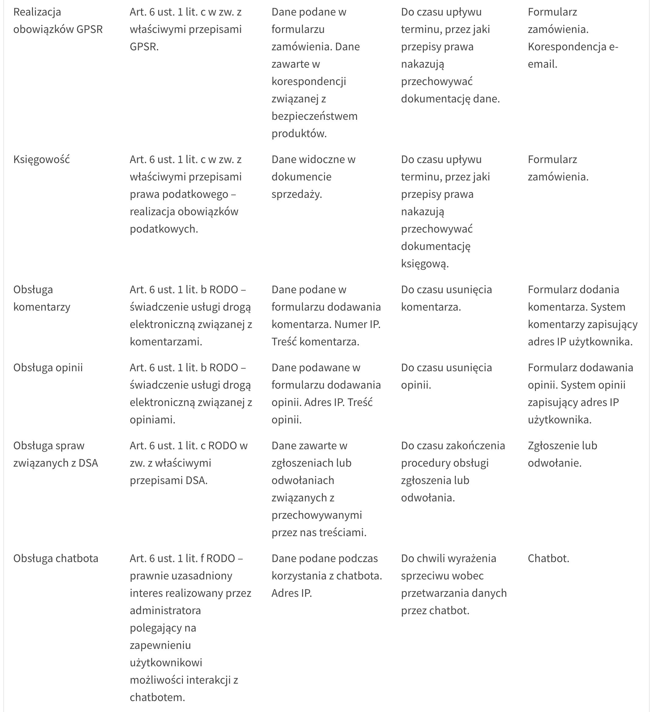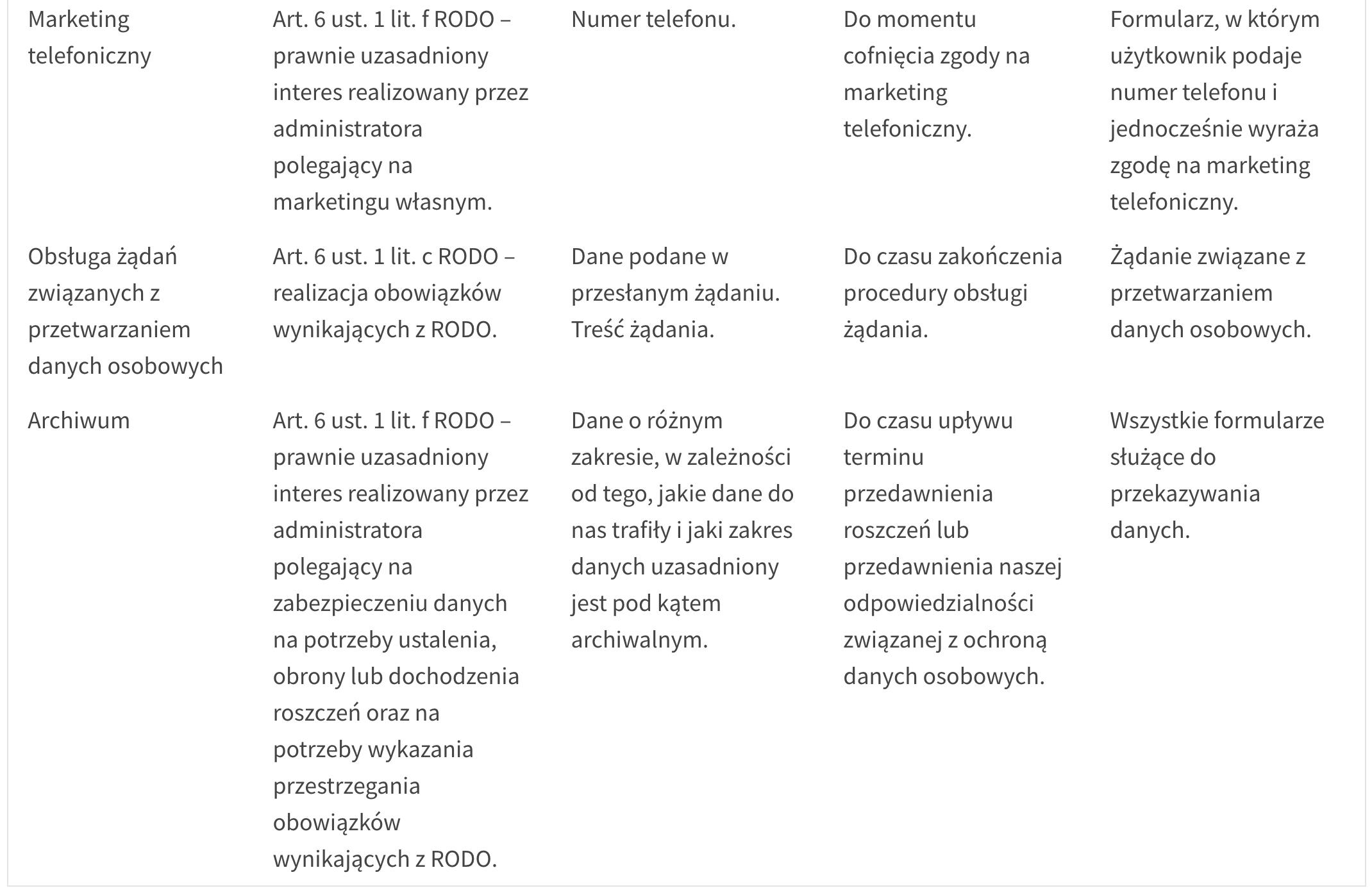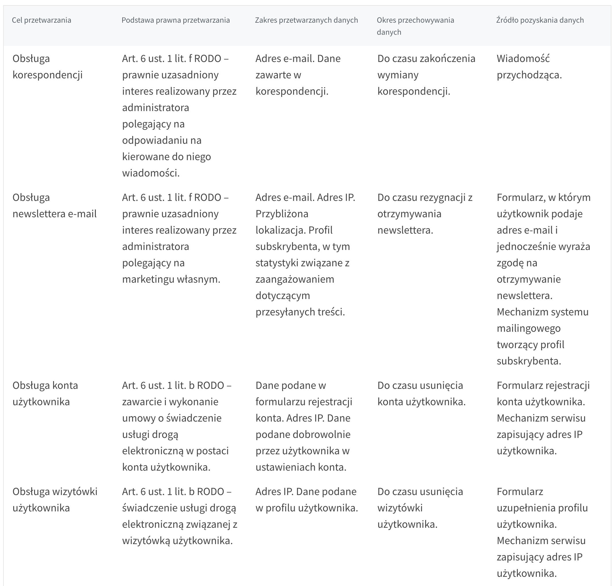 Twoje dane osobowe przechowujemy tak długo, jak to jest uzasadnione w ramach danego celu przetwarzania danych osobowych, w związku z czym okresy przetwarzania różnią się w zależności od celu - ich określenie znajdziesz w tabeli stanowiącej załącznik do polityki prywatności.Pamiętaj, że zakończenie przetwarzania Twoich danych w ramach jednego celu niekoniecznie musi prowadzić do całkowitego usunięcia lub zniszczenia Twoich danych osobowych, ponieważ dane mogą być przetwarzane w ramach innego celu, przez okres dla niego wskazany. Przykładowo, w momencie zakończenia wymiany korespondencji kończymy przetwarzanie danych osobowych w ramach realizacji celu jakim jest obsługa korespondencji, ale dane zgromadzone w związku z obsługą korespondencji są dalej przechowywane w celu ich archiwizacji na potrzeby ustalenia, dochodzenia lub obrony roszczeń związanych z korespondencją. Całkowite usunięcie lub zniszczenie danych następuje w momencie, gdy zakończymy realizację wszystkich celów, najczęściej po upływie okresu przedawnienia roszczeń lub przedawnienia odpowiedzialności administracyjnej, lub okresu, przez który mamy prawny obowiązek przechowywać określone dane.# 8: Kim są odbiorcy Twoich danych osobowych?