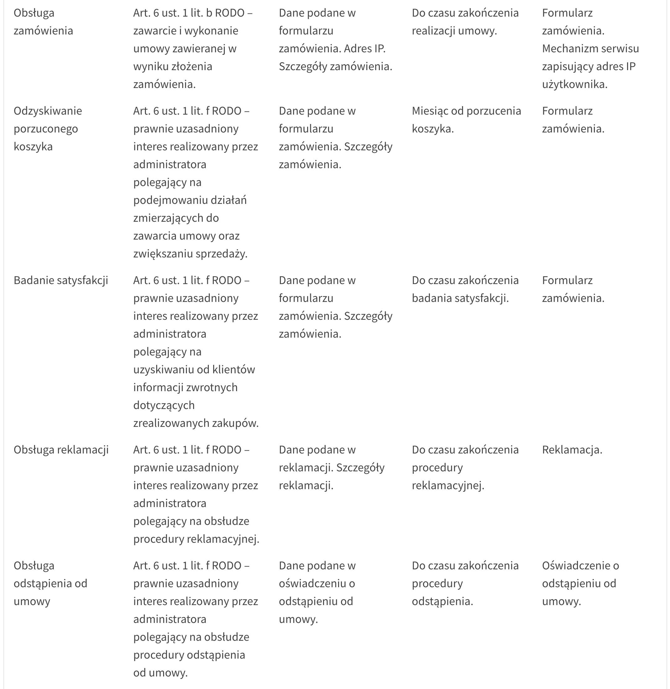 -pozostali podwykonawcy, którzy uzyskują dostęp do danych, jeżeli zakres ich działań wymaga takowego dostępuWszystkie podmioty wymienione powyżej przetwarzają Twoje dane na podstawie zawartych z nami umów powierzenia przetwarzania danych osobowych i gwarantują odpowiedni poziom ochrony danych osobowych.Jeżeli zajdzie taka potrzeba, Twoje dane mogą być udostępnione radcy prawnemu lub adwokatowi związanemu tajemnicą zawodową. Potrzeba może wynikać z konieczności skorzystania z pomocy prawnej wymagającej dostępu do Twoich danych osobowych.Twoje dane osobowe mogą być również przekazywane do urzędów skarbowych w zakresie niezbędnym do realizacji obowiązków podatkowo-rozliczeniowo-księgowych. Chodzi w szczególności o wszelkie deklaracje, raporty, sprawozdania i inne dokumenty księgowe, w których znajdują się Twoje dane osobowe.Twoje dane udostępniane są firmom kurierskim w zakresie niezbędnym do dostarczenia zamówienia. Firmy te stają się niezależnymi administratorami Twoich danych osobowych.Ponadto, bierzemy udział w programie badania satysfakcji klienta / opinii klienta. Jeżeli wyrazisz zgodę na objęcie badaniem satysfakcji, Twoje dane zostaną udostępnione organizatorowi systemu badania satysfakcji klienta / opinii klienta, który stanie się w ten sposób administratorem Twoich danych osobowych.Co więcej, gdy chodzi o Informacje Anonimowe, dostęp do nich mają dostawcy narzędzi lub wtyczek, które gromadzą Informacje Anonimowe. Dostawcy tych narzędzi są samodzielnymi administratorami danych w nich gromadzonych i mogą udostępniać te dane na zasadach określonych przez siebie we własnych regulaminach i politykach prywatności, na co nie mam wpływu.# 9: Czy przekazujemy Twoje dane do państw trzecich lub organizacji międzynarodowych?