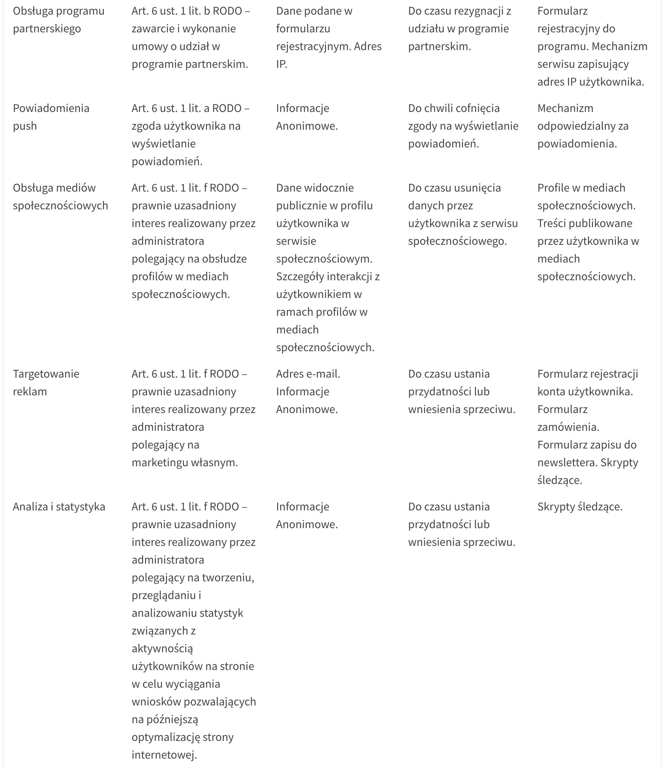 -Informacja te określane są w dalszej części niniejszej polityki prywatności jako "Informacje Anonimowe"Informacje Anonimowe same w sobie nie mają, w naszej ocenie, charakteru danych osobowych, ponieważ nie pozwalają nam na Twoją identyfikację oraz nie zestawiamy ich z typowymi danymi osobowymi, jakie gromadzimy na Twój temat. Niemniej jednak, biorąc pod uwagę rygorystyczne orzecznictwo Trybunału Sprawiedliwości Unii Europejskiej i podzielone zdania wśród prawników, z ostrożności, na wypadek, gdyby Informacjom Anonimowym został przypisany charakter danych osobowych, zawarliśmy w niniejszej polityce prywatności również szczegółowe wyjaśnienia w zakresie przetwarzania tych informacji.Nie jesteśmy w stanie zapewnić Ci dostępu do Informacji Anonimowych na Twój temat, ponieważ żadnych z Informacji Anonimowych nie jesteśmy w stanie przypisać do żadnego konkretnego użytkownika. Z poziomu narzędzi gromadzących Informacje Anonimowe mamy wgląd wyłącznie do zbioru statystyk i informacji nieprzypisanych do konkretnych osób. Co więcej, do informacji gromadzonych przez część narzędzi w ogóle nie mamy dostępu, jako że interesuje nas wyłącznie prawidłowe działanie funkcji zapewnianej przez dane narzędzie, a nie informacje przez nie gromadzone. Przykładowo, określona wtyczka może gromadzić jakieś informacje, ale nie są one nam w żaden sposób udostępniane, a my nie jesteśmy tymi informacjami w ogóle zainteresowani, ponieważ interesuje nas wyłącznie by dana funkcjonalność wtyczki (np. przesłanie formy newsletterowej) po prostu działała. Przetwarzanie Informacji Anonimowych pozwala na zapewnienie Ci możliwości korzystania z funkcjonalności dostępnych na stronie. Ponadto Informacje Anonimowe wykorzystywane są w celach analitycznych i statystycznych oraz marketingowych, takich jak ustawianie i targetowanie reklam.Ponieważ informacje Anonimowe gromadzone są przez zewnętrzne narzędzia, z których korzystamy, Informacje Anonimowe przetwarzane są również przez dostawców narzędzi na zasadach wynikających z ich regulaminów oraz polityk prywatności.Informacje Anonimowe wykorzystywane są również przez dostawców poszczególnych narzędzi do świadczenia i ulepszania usług, zarządzania nimi, opracowywania nowych usług, mierzenia skuteczności reklam, ochrony przed oszustwami i nadużyciami, a także personalizowania treści i reklam wyświetlanych w poszczególnych serwisach, witrynach i aplikacjach.Narzędzia, z których korzystamy, a które wiążą się z gromadzeniem Informacji Anonimowych zostały wymienione w załączniku nr 2 do niniejszej polityki prywatności.# 4: Skąd mamy Twoje dane osobowe?